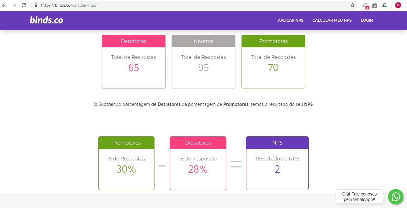 Para isso, acesse a calculadora NPS da binds.co e simule o seu NPS. Some quantas pessoas atribuíram cada nota e insira na tabela. Automaticamente, a plataforma faz a soma e indica quantos clientes promotores, neutros e detratores a sua empresa tem.
